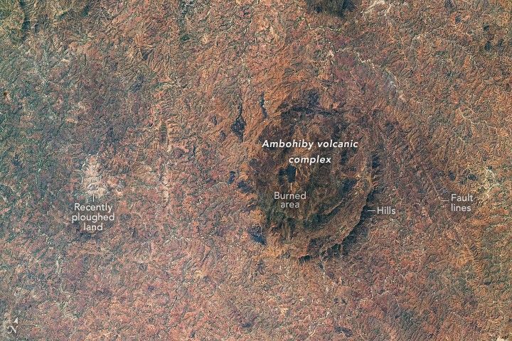 The concentric rings of an ancient, extinct volcanic system stand above the island nation’s relatively flat central highlands.