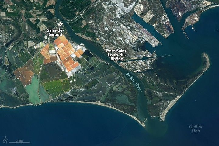 Along the left bank of the Rhône River, orange to white rectangular salt pans are interwoven with coastal marsh along the Gulf of Lion at the bottom of the image. Additional gridded land along the coast, potentially also salt pans, vary in color from burnt orange, to seafoam and verdant green stand apart. To the right of the Rhône River is Port-Saint-Louis-du-Rhône. The shipping port and human settlement area  landscape appears streaked with gray and white around the gray concretes and brown roofed buildings.