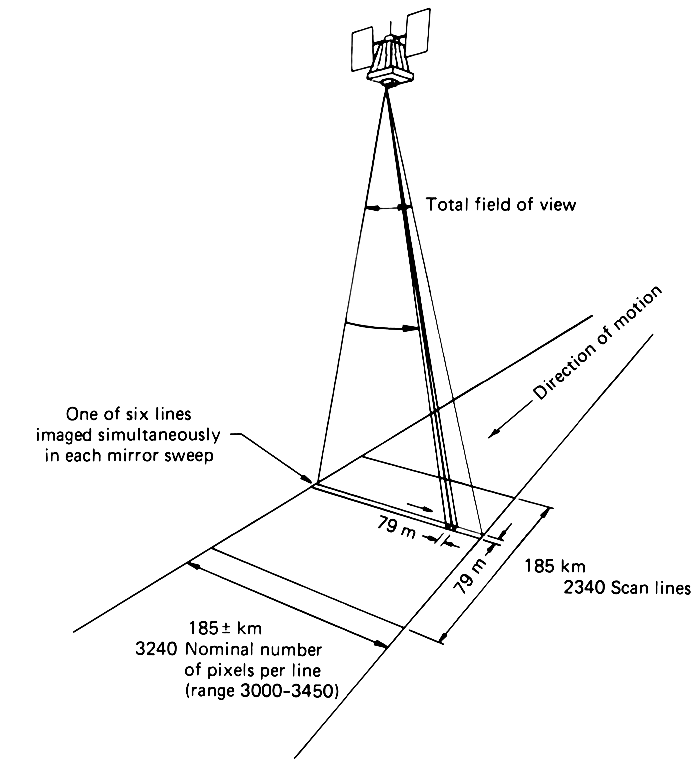 Multispectral Scanner (MSS) imaging concept showing the relationship between satellite position and ground coverage pattern. The diagram illustrates how the scanner captures six scan lines simultaneously during each mirror sweep, creating 79 m pixels across a 185 km swath containing approximately 3240 pixels per line. As the satellite moves in its orbit, it creates 2340 scan lines to form a complete image scene, demonstrating the whiskbroom scanning technique used in early Earth observation satellites.