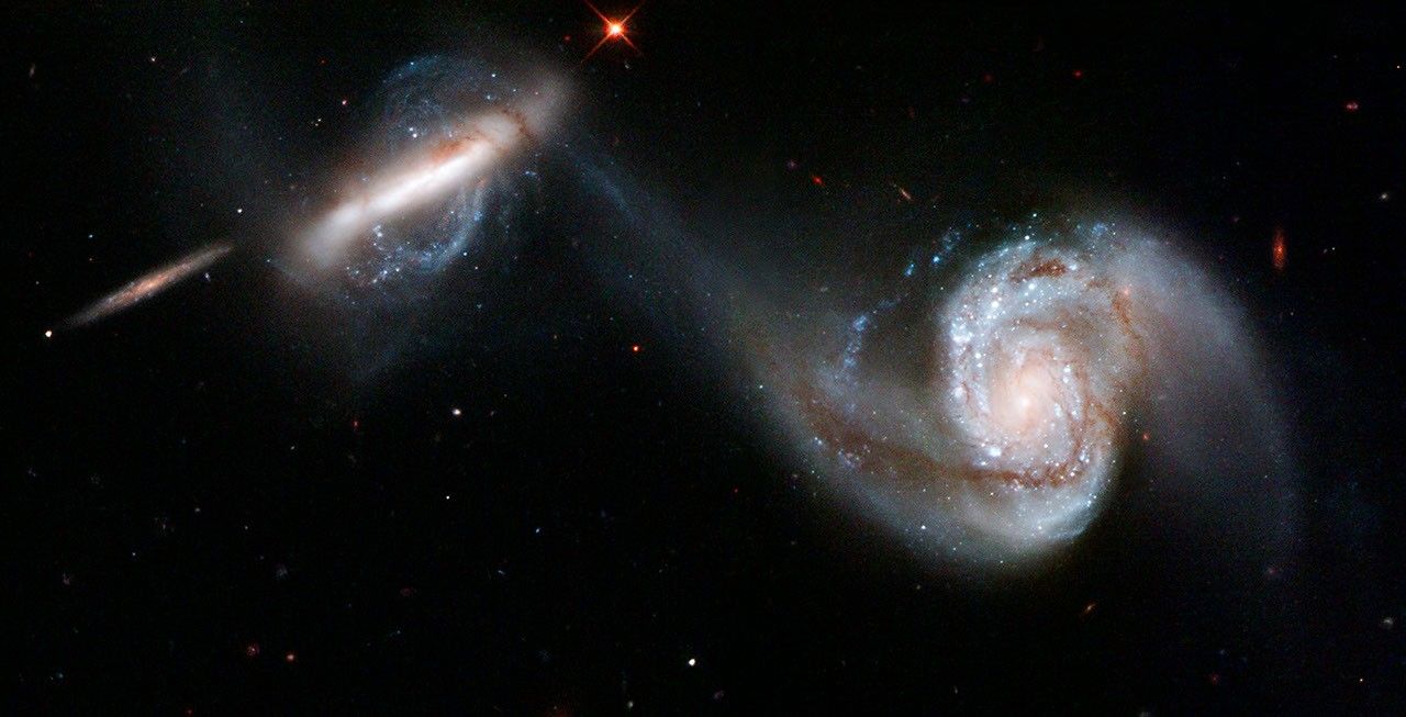 Two galaxies in this Hubble Space Telescope image, each containing a vast number of stars, are swinging past each other in a graceful performance choreographed by gravity. The pair, known collectively as Arp 87, is among hundreds of interacting and merging galaxies known in our nearby universe. The two main players comprising Arp 87 are NGC 3808 on the right (the larger of the two galaxies) and its companion NGC 3808A on the left. NGC 3808 is a nearly face-on spiral galaxy with a bright ring of star formation and several prominent dust arms. Stars, gas, and dust flow from NGC 3808, forming an enveloping arm around its companion.