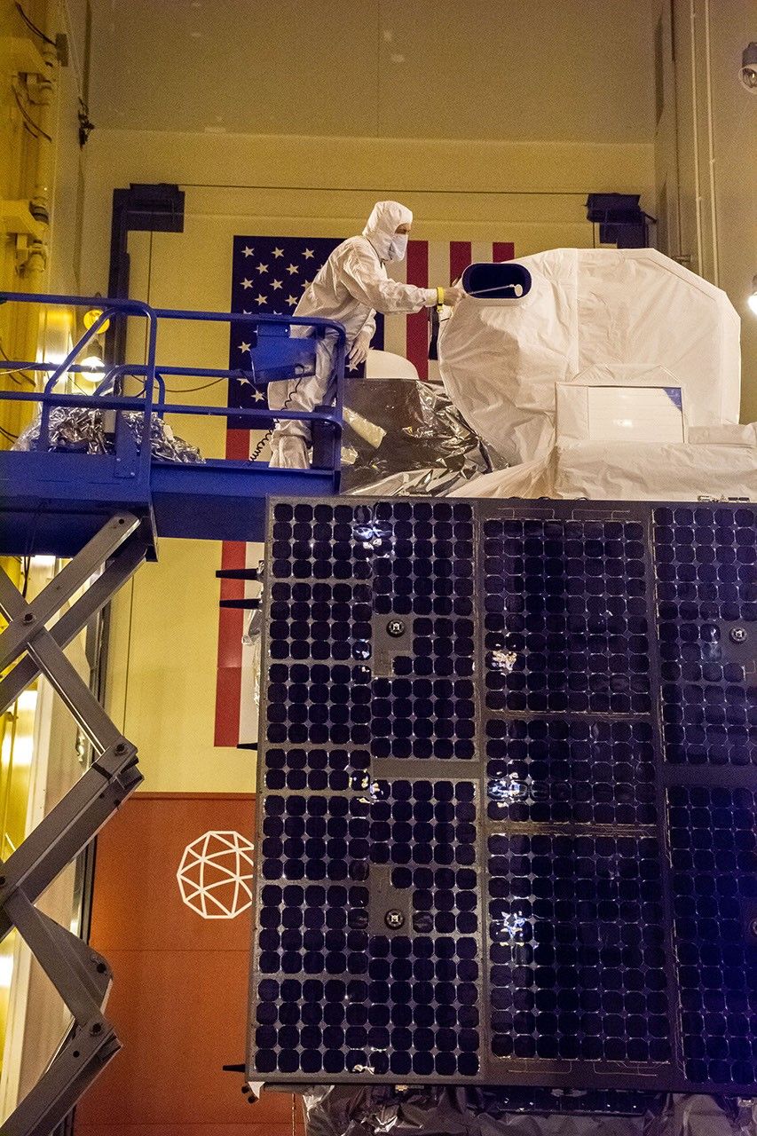 The Landsat 9 instrument cover is removed from the spacecraft inside the Integrated Processing Facility (IPF) at Vandenberg Space Force Base in California.