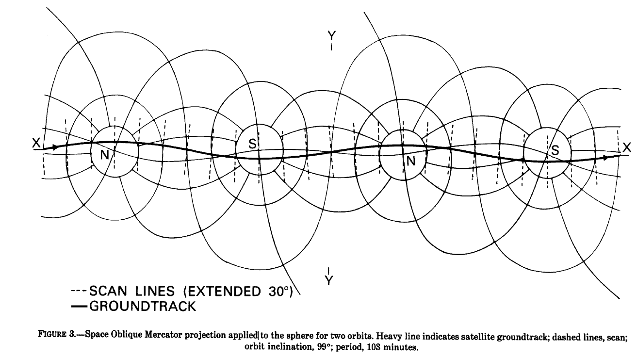 Image Credit: Space Oblique Mercator Projection Mathematical Development, USGS Bulletin 1518 by John Parr Synder