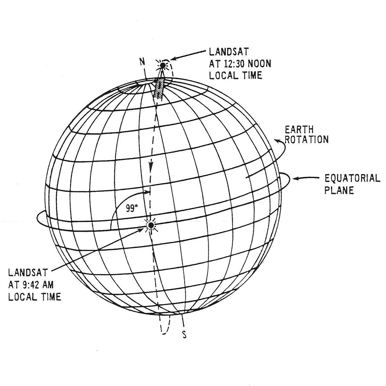 Landsats 1–3 had altitudes of 917 km (570 miles), 99° orbital inclinations, and sun-synchronous orbits. Each spacecraft therefore crossed the Equator at approximately the same local time on the sunlit side of Earth during each orbit.