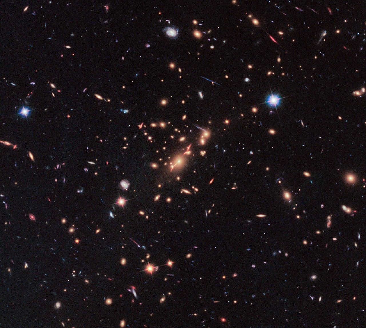 The gravity of this massive galaxy cluster, MACS J2129-0741, magnifies, brightens, and distorts the images of remote background galaxies, making them visible to our telescopes. The streaks and arcs visible in this image are distant galaxies whose light is distorted by the gravity of the cluster. By combining the power of a “natural lens” in space with the capability of the Hubble Space Telescope, astronomers made a surprising discovery — the first example of very compact yet massive disk-shaped and rotating galaxy that stopped making stars only a few billion years after the Big Bang. Finding a galaxy that is pancake-shaped — much like our own Milky Way — so early in the history of the universe challenges the current understanding of how massive galaxies form and evolve.