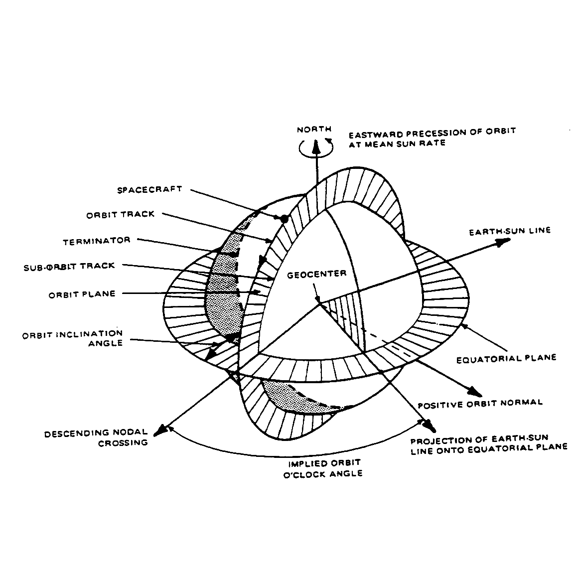 Schematic diagram illustrating the geometry of a sun-synchronous orbit for the morning descending node of Landsat. This schematic appears in the Landsat 6 Programming and Control Handbook that was prepared by Martin Marietta Astro Space in 1993. Like all of the Landsat satellites, Landsat 6 would have been in a sun-synchronous orbit had its launch been successful. The L6 Handbook tells us, “for a nominal sun-synchronous orbit (i.e., one that precesses at a rate of 0.9856°/day or 360°/year), the scene and spacecraft illumination conditions vary throughout the year but repeat on a yearly cycle. The changes during the year occur because apparent Sun motion in the ecliptic plane is non-uniform, whereas the satellite orbit precession is uniform relative to the equatorial plane. The parameter that determines the actual illumination time histories is the orbit o’clock angle. This is the angle between the ascending or descending node and the “mean sun” vector. For a perfect unsynchronized orbit, the orbit o’clock angle remains constant. Furthermore, the Local Mean Sun Time (LMST) of the nodal crossing is the orbit o’clock angle. The relationship is shown in [this figure].”