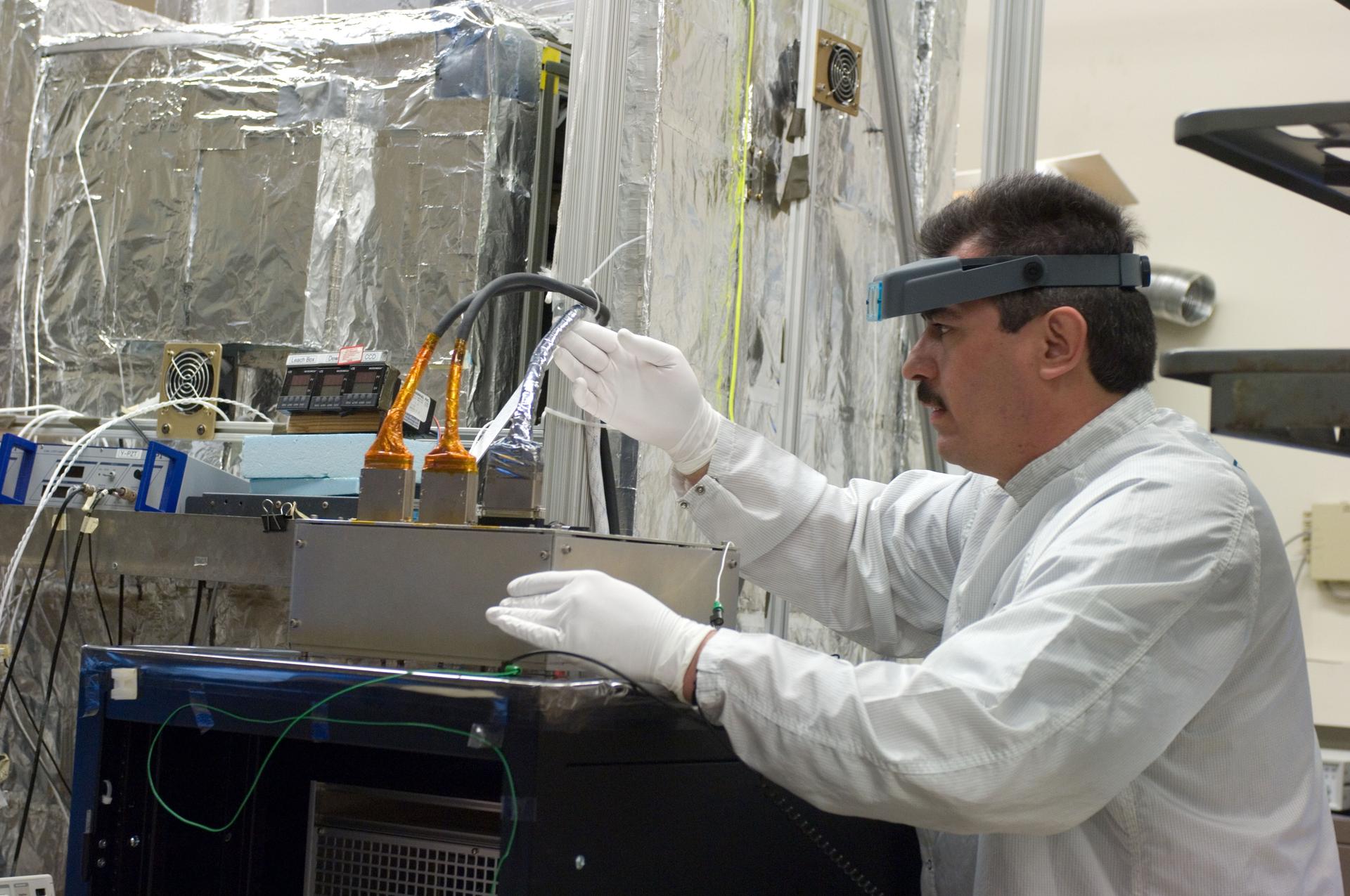 Kepler project; technicians from Ball Aerospace work on and in the test chamber assembled at Nasa Ames Research center testing components