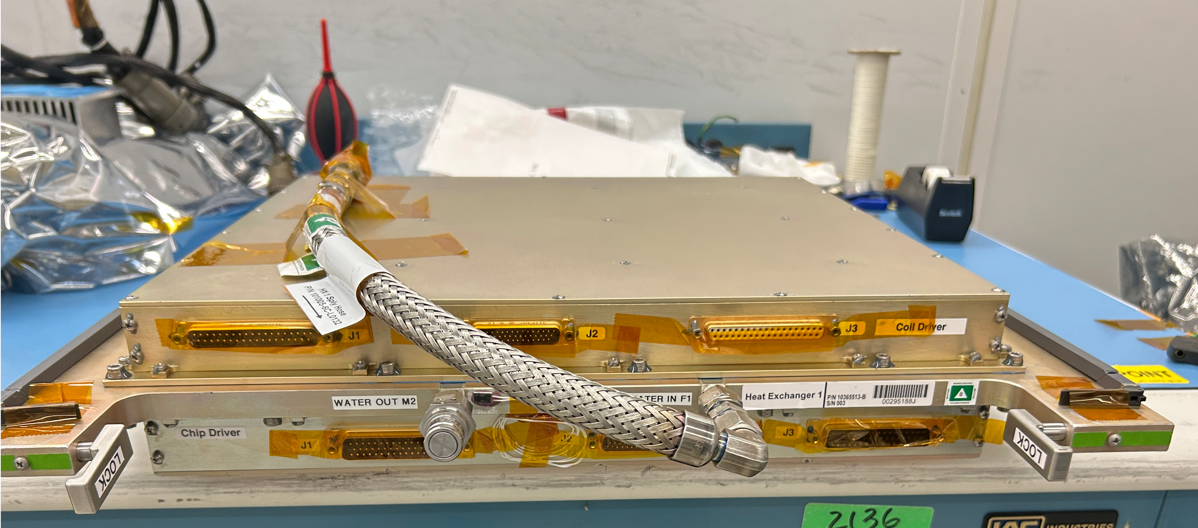 Science Module 3X before its delivery to ISS with its magnetic shield (silver) and a panel (gold) for electrical, optical and fluid connections.