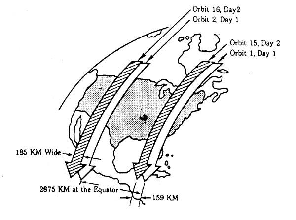 This illustration demonstrates the systematic Earth observation coverage pattern of a polar-orbiting satellite. The diagram shows how consecutive orbital passes (Orbits 1, 2, 15, and 16) create imaging swaths across the Earth's surface over a two-day period.