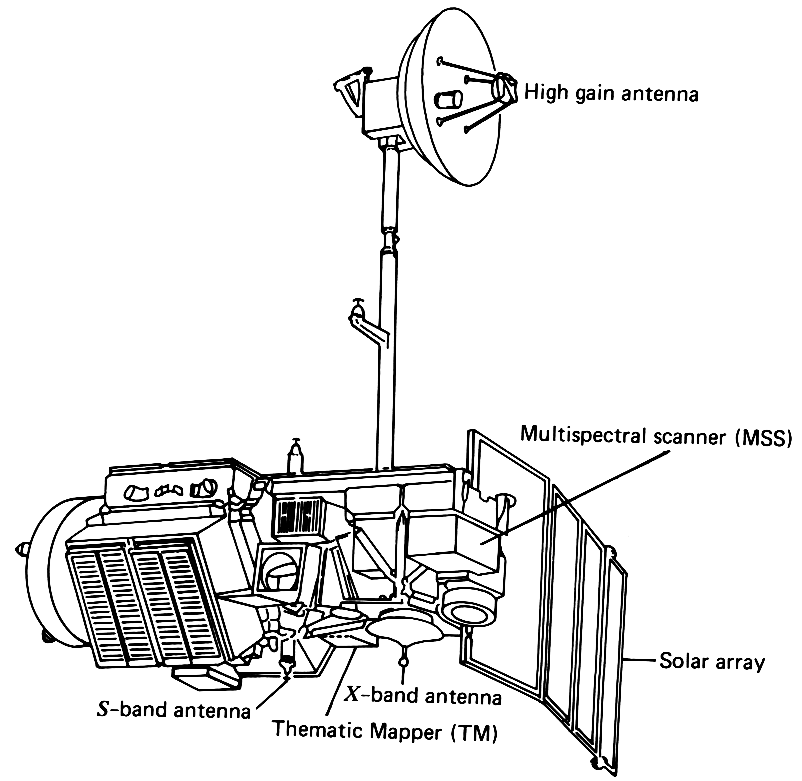 Technical line drawing of a the Landsat 4-5 satellite with labeled components including a high gain antenna on a pole mount, multispectral scanner (MSS), solar array panels, Thematic Mapper (TM), S-band antenna, and X-band antenna. The spacecraft body contains various sensors and instruments, with the solar array extending from the right side.