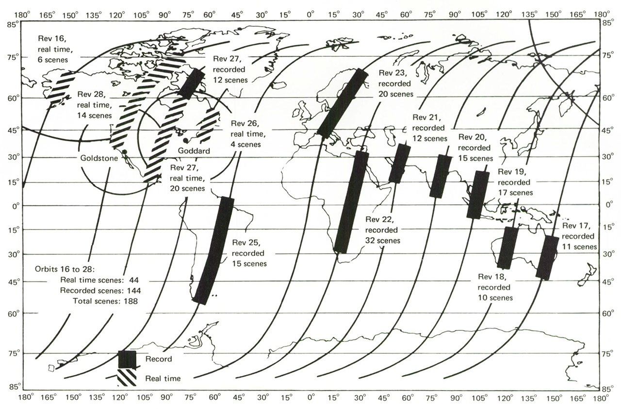 A typical day of image scheduling by the OCC. The solid lines are scenes recorded to the wideband video tape recorders (WBVTR), the dashed lines are direct downlinks.