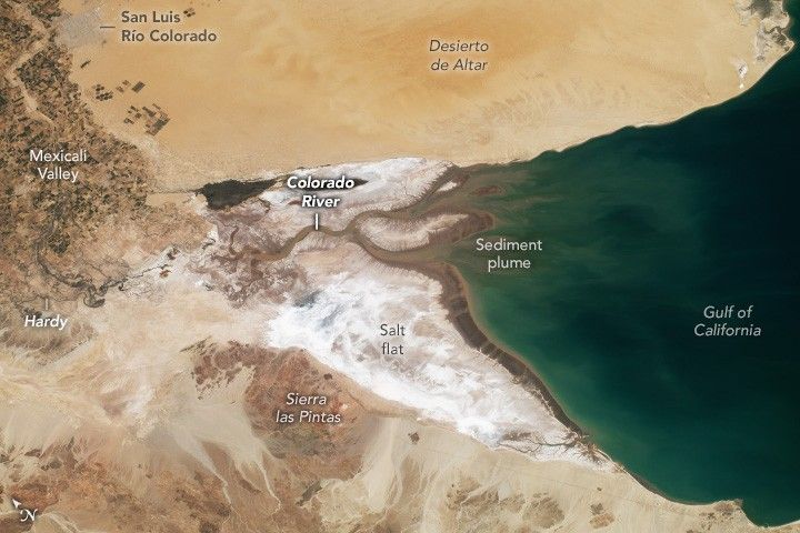 A salt-encrusted landscape surrounds the Colorado River where it empties into the Gulf of California.
