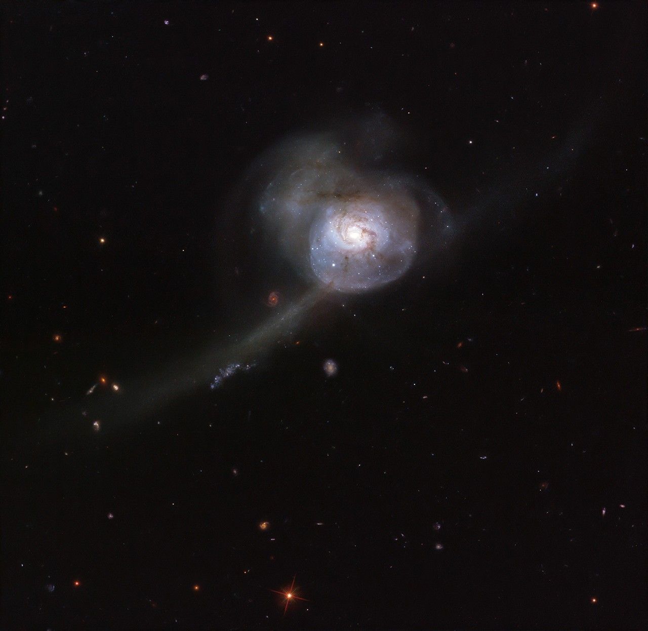 Appearing within the boundless darkness of space, the Hubble Space Telescope’s snapshot of NGC 34 looks more like an otherworldly, bioluminescent creature from the deep oceans than a galaxy. Lying in the constellation Cetus (The Sea Monster), the galaxy’s outer region appears almost translucent, pinpricked with stars and strange wispy tendrils. The main cause for this galaxy’s odd appearance lies in its past. If we were able to reverse time by a few million years, we would see two spiral galaxies on a direct collision course. When these galaxies crashed into one another, their intricate patterns and spiral arms were permanently disturbed. This image shows the galaxy's bright center, a result of this merging event that has created a burst of new star formation and lit up the surrounding gas. As the galaxies continue to intertwine and become one, NGC 34’s shape will become more like that of an peculiar galaxy, devoid of any distinct shape.