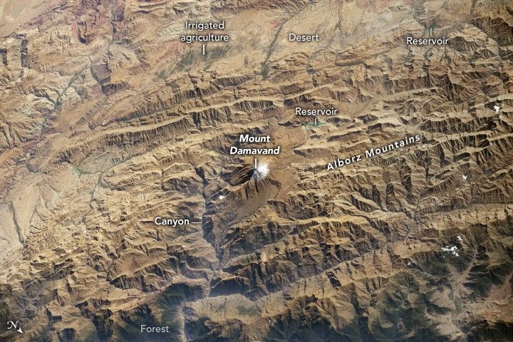 The dormant volcano in northern Iran lies in the Alborz Mountains, which separate the region’s wet coastal lowlands from the deserts toward the south.