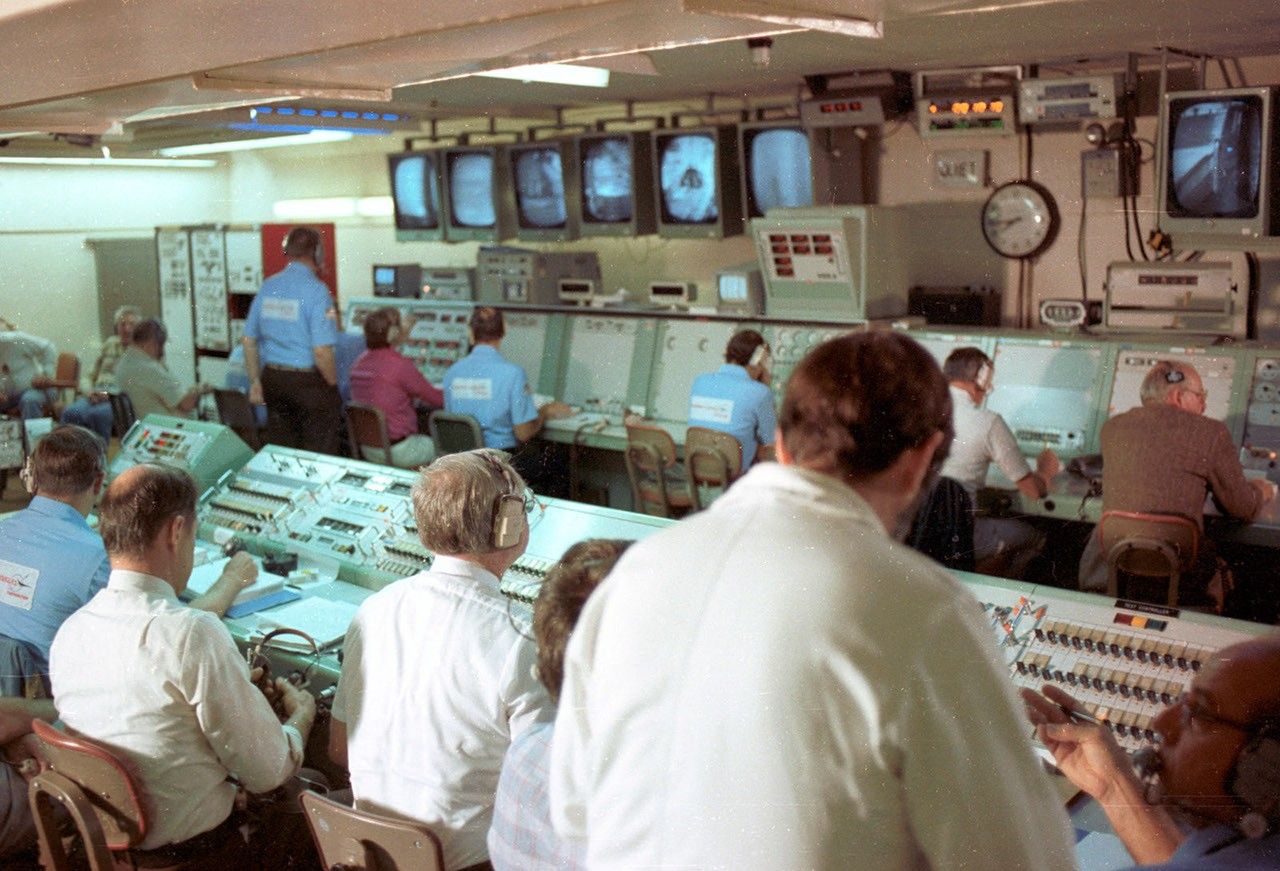 Historical spacecraft launch control room with mission personnel monitoring consoles and displays during operations.