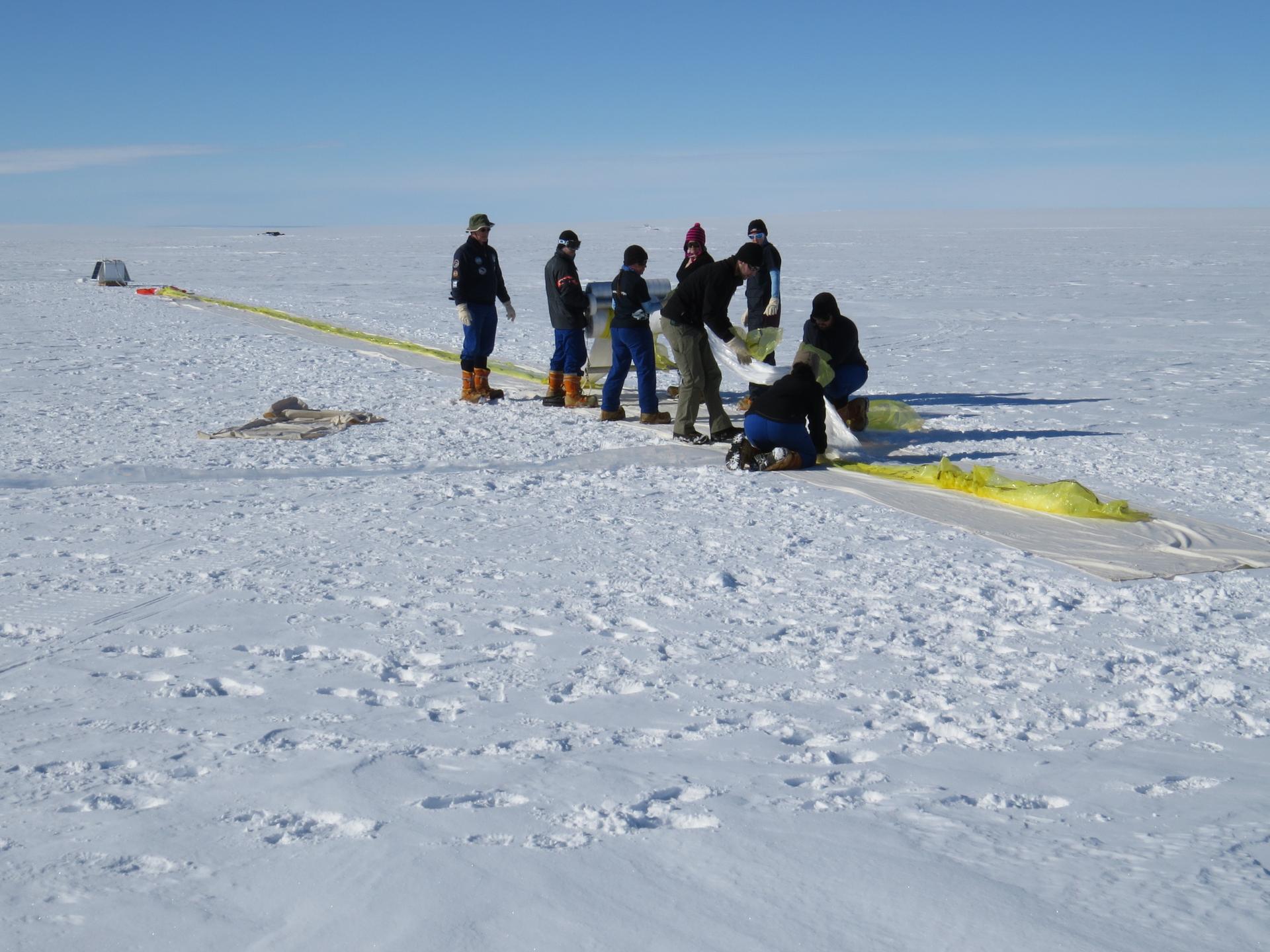 The BARREL team at the South African research station, SANAE IV, lay out the 130-foot-long balloon on the ground to prepare for inflation. The entire set up and launch process takes three to four hours. Credit: NASA/Goddard/BARREL/Nicky Knox Read more: www.nasa.gov/content/goddard/nasas-barrel-returns-success... -- Three months, 20 balloons, and one very successful campaign. The team for NASA's BARREL – short for Balloon Array for Radiation belt Relativistic Electron Losses -- mission returned from Antarctica in March 2014. BARREL's job is to help unravel the mysterious Van Allen belts, two gigantic donuts of radiation that surround Earth, which can shrink and swell in response to incoming energy and particles from the sun and sometimes expose satellites to harsh radiation. While in Antarctica, the team launched 20 balloons carrying instruments that sense charged particles that are scattered into the atmosphere from the belts, spiraling down the magnetic fields near the South Pole. Each balloon traveled around the pole for up to three weeks. The team will coordinate the BARREL data with observations from NASA's two Van Allen Probes to better understand how occurrences in the belts relate to bursts of particles funneling down toward Earth. BARREL team members will be on hand at the USA Science and Engineering Festival in DC on April 26 and 27, 2014 for the exhibit Space Balloons: Exploring the Extremes of Space Weather. NASA image use policy. NASA Goddard Space Flight Center enables NASA’s mission through four scientific endeavors: Earth Science, Heliophysics, Solar System Exploration, and Astrophysics. Goddard plays a leading role in NASA’s accomplishments by contributing compelling scientific knowledge to advance the Agency’s mission. Follow us on Twitter Like us on Facebook Find us on Instagram