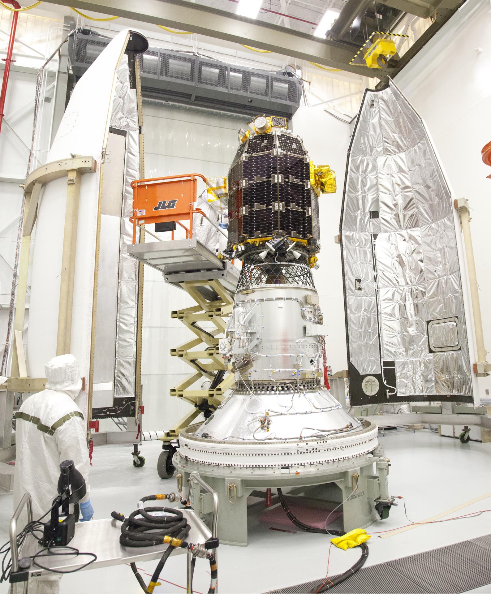 Engineers at NASA's Wallops Flight Facility in Virginia prepare to encapsulate the LADEE spacecraft into the fairing of the Minotaur V launch vehicle nose-cone. Credit: NASA/Wallops/Terry Zaperach ----- What is LADEE? The Lunar Atmosphere and Dust Environment Explorer (LADEE) is designed to study the Moon's thin exosphere and the lunar dust environment. An "exosphere" is an atmosphere that is so thin and tenuous that molecules don't collide with each other. Studying the Moon's exosphere will help scientists understand other planetary bodies with exospheres too, like Mercury and some of Jupiter's bigger moons. The orbiter will determine the density, composition and temporal and spatial variability of the Moon's exosphere to help us understand where the species in the exosphere come from and the role of the solar wind, lunar surface and interior, and meteoric infall as sources. The mission will also examine the density and temporal and spatial variability of dust particles that may get lofted into the atmosphere. The mission also will test several new technologies, including a modular spacecraft bus that may reduce the cost of future deep space missions and demonstrate two-way high rate laser communication for the first time from the Moon. LADEE now is ready to launch when the window opens on Sept. 6, 2013. Read more: www.nasa.gov/ladee NASA image use policy. NASA Goddard Space Flight Center enables NASA’s mission through four scientific endeavors: Earth Science, Heliophysics, Solar System Exploration, and Astrophysics. Goddard plays a leading role in NASA’s accomplishments by contributing compelling scientific knowledge to advance the Agency’s mission. Follow us on Twitter Like us on Facebook Find us on Instagram