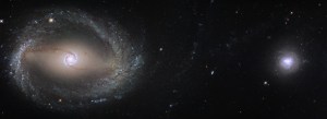 Galaxies come in a range of shapes and sizes, and astronomers use this fact to classify them based on their appearance. NGC 1512, the large galaxy to the left in this image, is classified as a barred spiral, named after the bar composed of stars, gas, and dust slicing through its center. The tiny NGC 1510 to the right, on the other hand, is a dwarf galaxy. Despite their very different sizes, each galaxy affects the other through gravity, causing slow changes in their appearances. The bar in NGC 1512 acts as a cosmic funnel, channeling the raw materials required for star formation from the outer ring into the heart of the galaxy. This pipeline of gas and dust in NGC 1512 fuels intense star birth in the bright, blue, shimmering inner disk known as a circumnuclear starburst ring, which spans 2,400 light-years. Both the bar and the starburst ring are thought to be at least in part the result of the interaction between the two galaxies — a merger that has been going on for 400 million years. NGC 1512, which has been observed by Hubble in the past, is also home to a second, more serene, star-forming region in its outer ring. This ring is dotted with dozens of HII regions, where large swathes of hydrogen gas are subject to intense radiation from nearby, newly formed stars. This radiation causes the gas to glow and creates the bright knots of light seen throughout the ring. Remarkably, NGC 1512 extends even farther than we can see in this image — beyond the outer ring — displaying malformed, tendril-like spiral arms enveloping NGC 1510. These huge arms are thought to be warped by strong gravitational interactions with NGC 1510 and the accretion of material from it. But these interactions are not just affecting NGC 1512; they have also taken their toll on the smaller of the pair. For more information, visit: www.spacetelescope.org/news/heic1712/