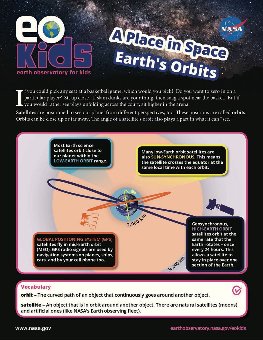 Location, location, location! Where a satellite orbits Earth is a major factor in how well it does its job. It takes a lot of different perspectives to collect data to help us understand how our planet works. Explore Earth’s different orbits, then race your friends in a scale model of high, mid and low Earth orbits. Who do you think can make the most laps in a minute?