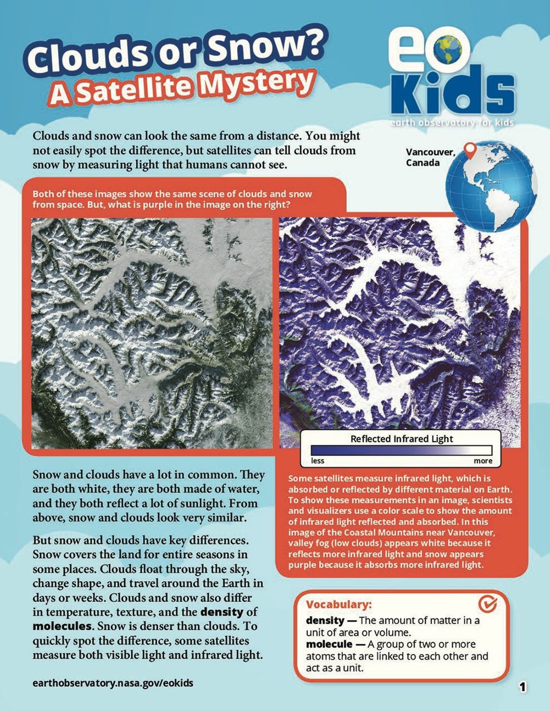 EO Kids is investigating how similar snow and clouds look from space. In this issue, discover how satellites measure light to help scientists know which is which. You can also create your very own cloud in a bottle with our “DIY Science” activity. Plus, get involved as a citizen scientist by observing clouds for NASA.