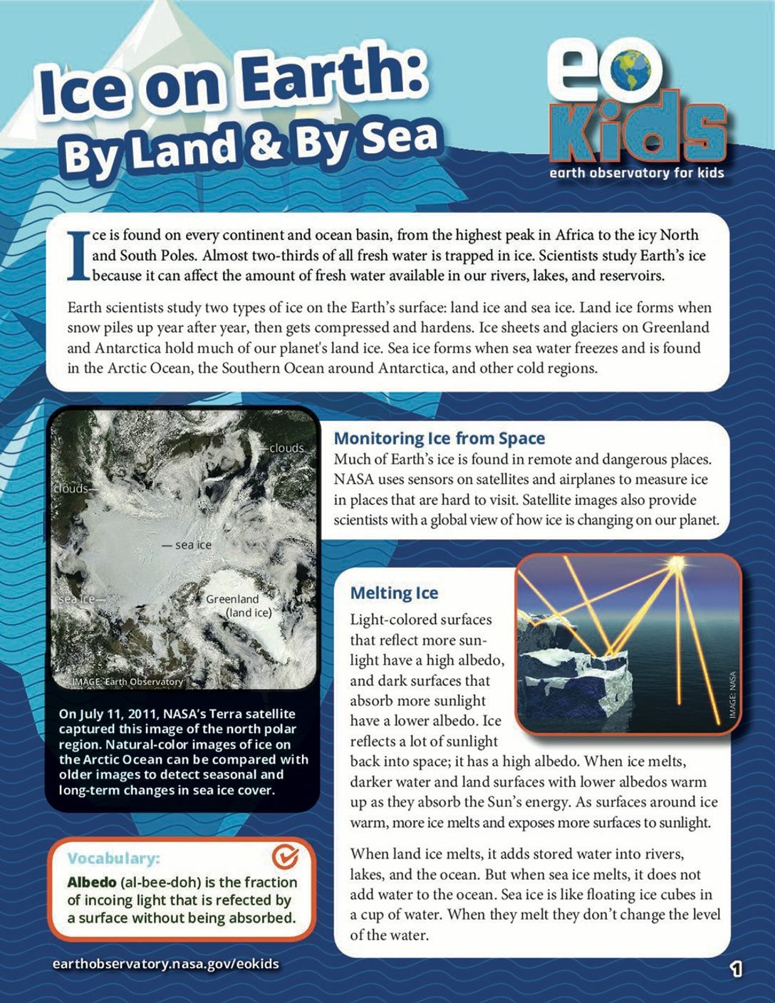 This month, EO Kids is covering a “cool” topic in Earth science. This edition of EO Kids, "Ice on Earth: By Land & By Sea," covers two types of ice on the Earth’s surface and how NASA scientists use satellites to study these frozen features from space. Plus, follow two NASA scientists on their extreme camping trip for science across an unexplored stretch of Antarctica.