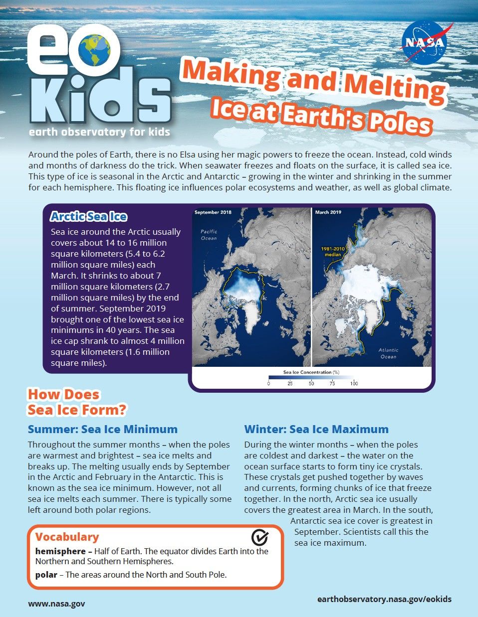 EO Kids is discovering more about sea ice and its effect on ecosystems and global climate by looking at how and when it forms across the globe. Plus, learn how different types of water freeze in our “DIY Science” activity: “Saltwater is Cool (Literally).”