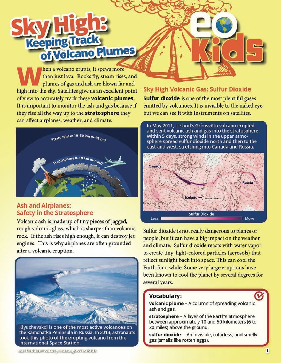 EO Kids is blasting into the sky and following the trails of volcanic plumes as they travel across the globe. In this issue, you will discover how satellites help us make air travel safer in the aftermath of an eruption. You can create your own flipbook animation and track the traveling ash and gas in this month’s activities. Plus, see a volcano in 3-D.