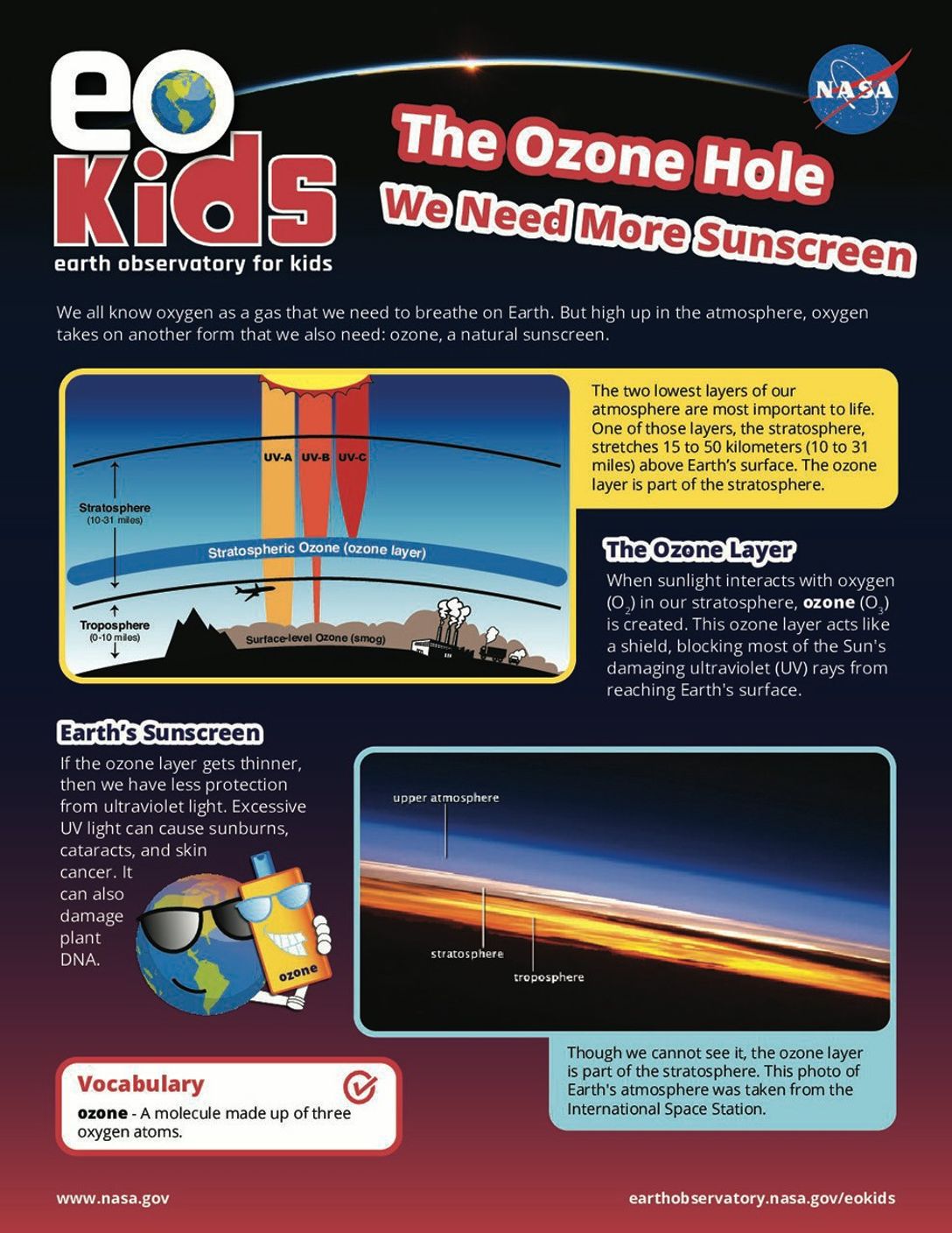 There is good news! EO Kids is exploring how the hole in the ozone layer is shrinking in, “The Ozone Hole: We Need More Sunscreen.” Plus, make your own map of the ozone hole using NASA data in the “Data Viz” activity, “Mapping Ozone.”