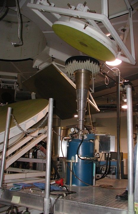 The image to the right shows two of the beam waveguide reflectors inside the antenna mounting. These two reflectors maintain the microwave beam as the antenna moves around in azimuth. Similar reflectors, located higher up in the structure, permit freedom of movement in elevation.