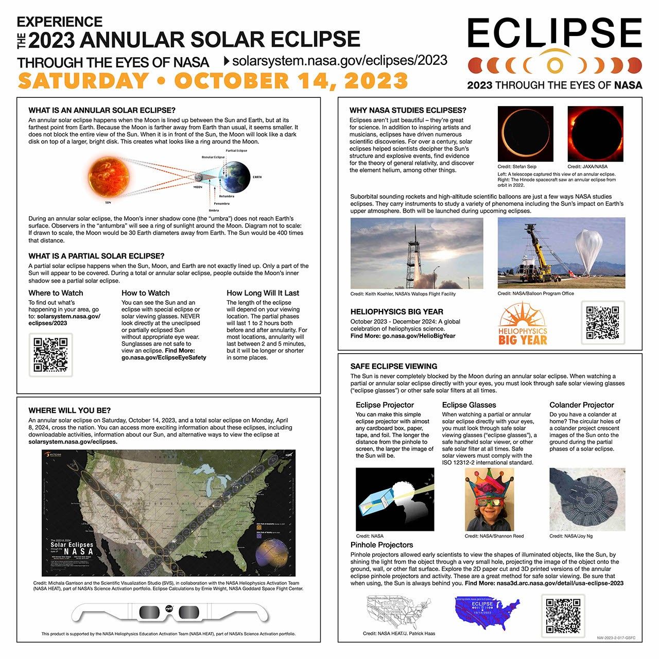 This downloadable poster is a visually stunning depiction of the upcoming annular solar eclipse on October 14, 2023. The front of the poster captures the breathtaking beauty of the annular eclipse, showcasing its unique ring-like shape formed by the Moon partially blocking the Sun.