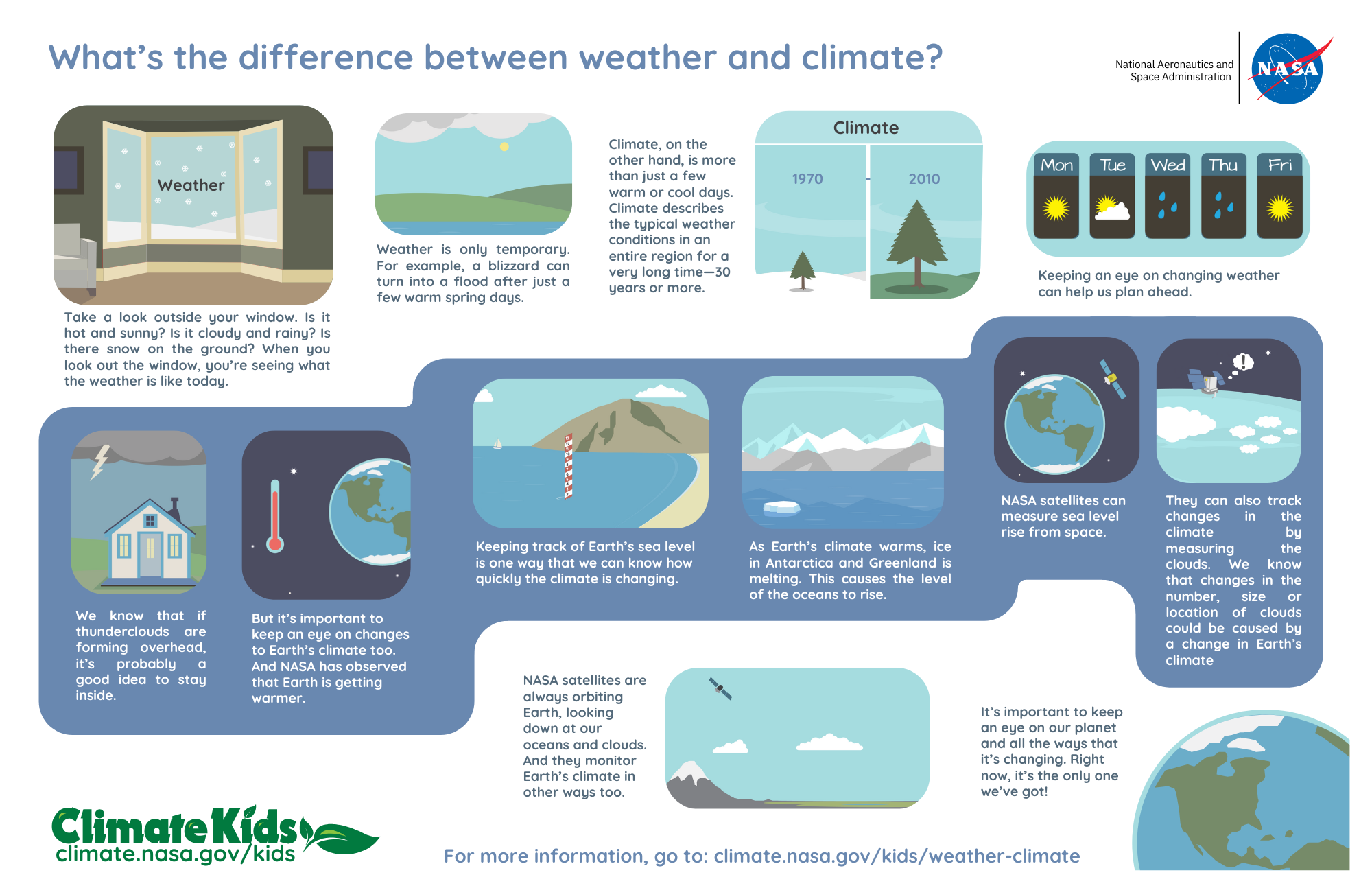 This ~3 minute video with accompanying downloadable poster gives an overview of the difference between climate and weather by giving examples of each and how NASA's Global Precipitation Measurement (GPM) mission tracks changes in temperature, sea level, and clouds.