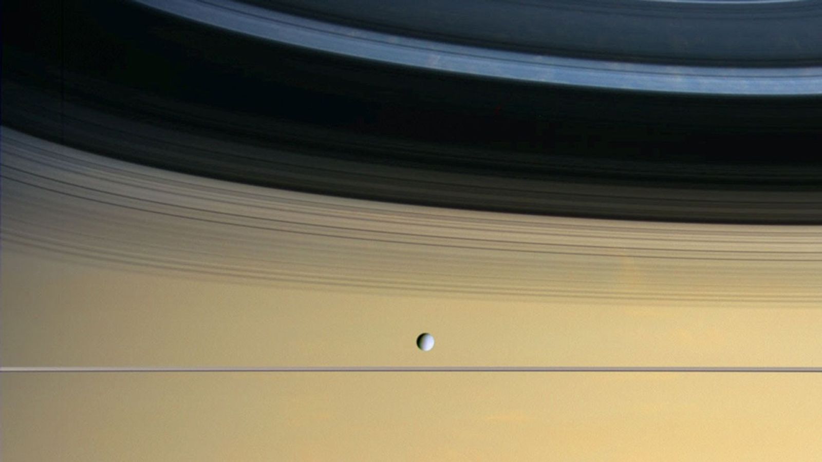 Saturn's icy moon Dione floats in front of the giant planet in this view from NASA's Cassini spacecraft. - Full image and caption