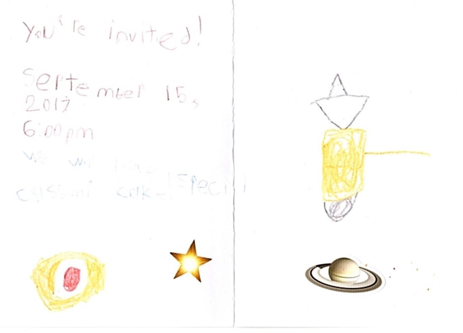 “Jackson’s Goodbye Cassini Party! You’re invited! September 15, 2017. 6:00 p.m. We will have special Cassini cake.”