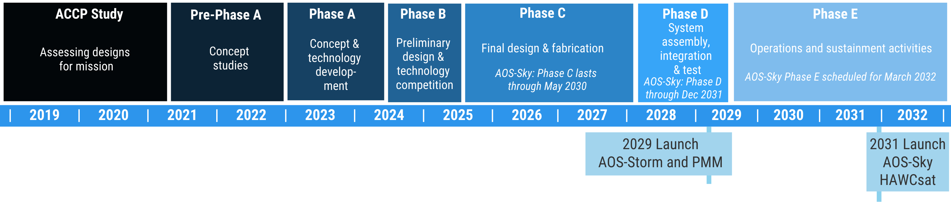 A high-level overview of the AOS mission timeline is presented here. The AOS mission was preceded by the Aerosols, Cloud, Convection and Precipitation (ACCP) Study. The nominal phases shown apply to AOS satellites in an inclined orbit (AOS-Storm). The timing of mission phases associated with the polar AOS satellite (AOS-Sky) are noted in italics.
