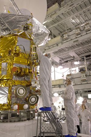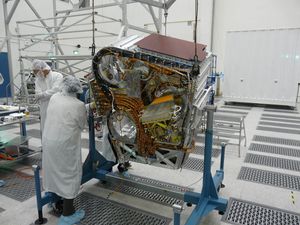 Less than two months before launch, team members conduct their final checks of NASA's Aquarius instrument at Vandenberg Air Force…
