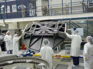 Engineers test Aquarius 2.5 meter reflector in the clean room at NASA's Jet Propulsion Laboratory in Pasadena, Calif.