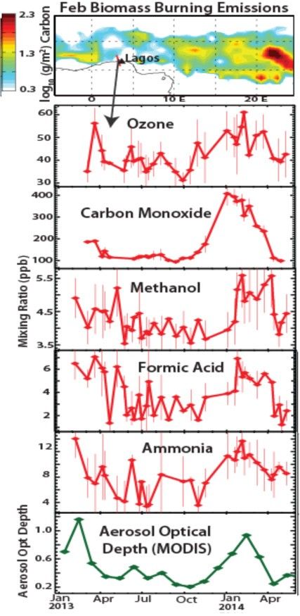 Lagos carbon monoxide, formic acid, and ammonia have higher peak values than Mexico City, but ozone is lower. These differences in chemical regime are being investigated.