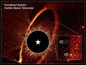 This composite Hubble Space Telescope image shows the debris ring and dust clouds cs1 and cs2 around the star Fomalhaut.…
