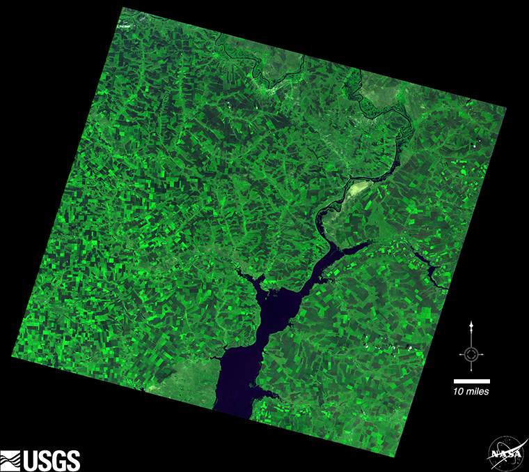 Landsat 2’s first light image shows a striking box pattern of wells and access roads along Canadian Highway 22. Following the 1953 Pembina oil field discovery, this sparsely populated farming and logging town experienced explosive growth and extensive infrastructure development to support the burgeoning oil and gas industry.
