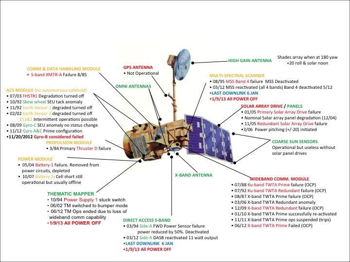 MSS operations were suspended in 1995 after the TM took over primary imaging duties. Following the failure of the TM in 2011, the MSS was reactivated and resumed collecting data over the U.S.
