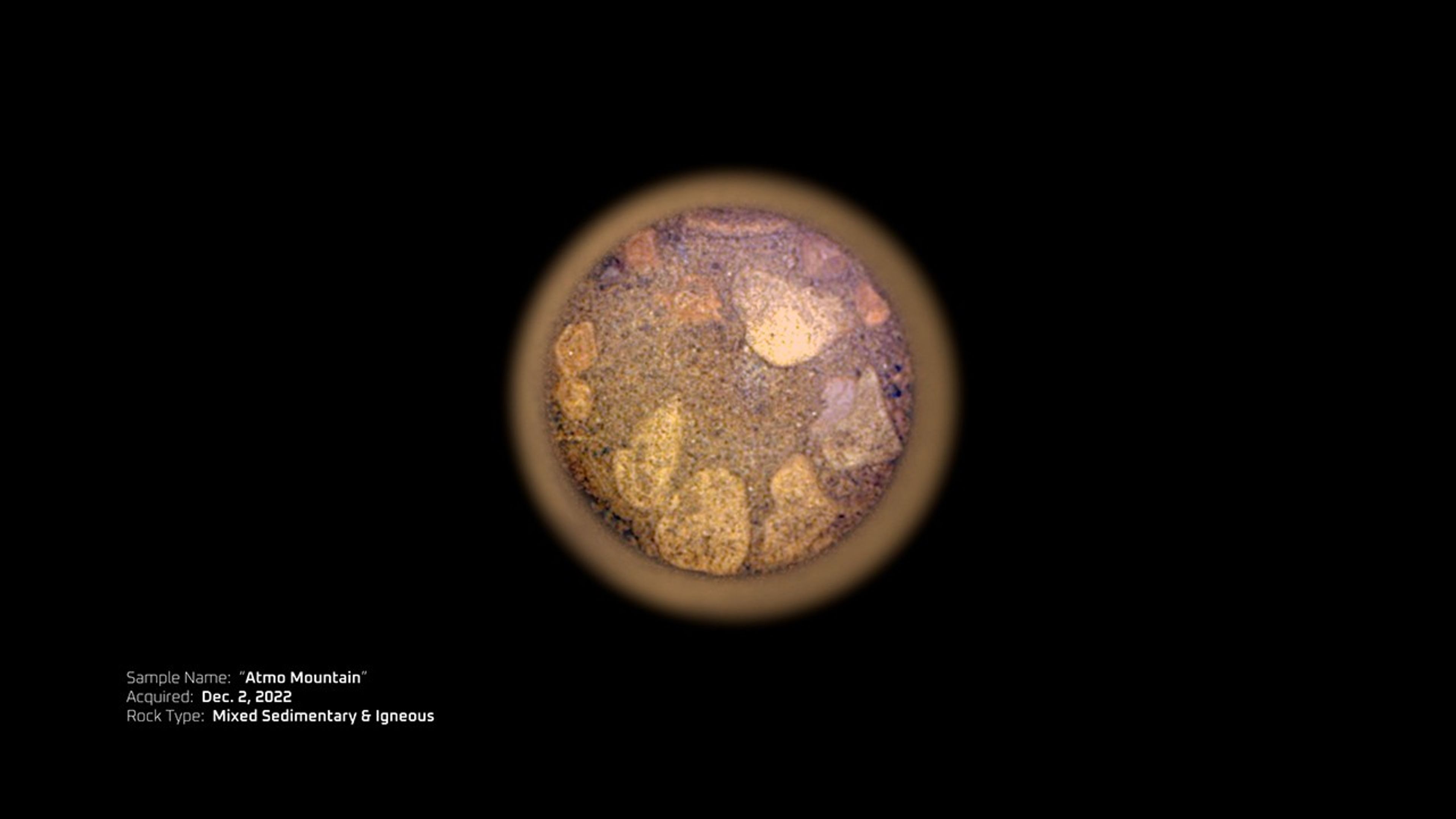 | 17 | Dec. 2, 2022 | 634 | Atmo Mountain | Observation Mountain | Delta Front | Perseverance Rover | Regolith | 5.30 2.09 | Likely mixed sedimentary and igneous grains | |