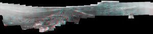 This image is an anaglyph version of the last 360-degree panorama taken by the Opportunity rover's Pancam from May 13 through June 10, 2018. The panorama appears in 3D when seen through blue-red glasses with the red lens on the…