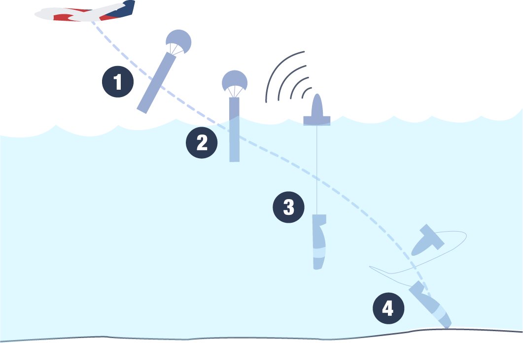 To drop a probe, the aircraft flies low (between 500–5000 feet) in order to make sure that no people, equipment, or wildlife are near the drop zone. Do the probes bother ocean animals? No, the probes don’t emit any sounds and operators always make sure the water is clear before dropping them.