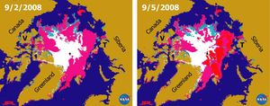 This pair of sea ice maps was derived from radar data from NASA's QuikScat satellite scatterometer during September, 2008 showing the Arctic Sea along the Northern Sea Route and the Northwest Passage.
