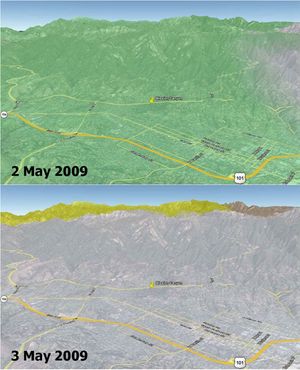 In Santa Barbara County, a wildfire, called the Jesusita fire, ignited on May 5, 2009 in the Cathedral Peak area northwest of Mission Canyon. Data is from NASA's QuikScat satellite.