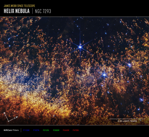 This image of the Helix Nebula, captured by the NIRCam (Near-Infrared Camera) instrument on Webb, includes compass arrows, scale bar,…