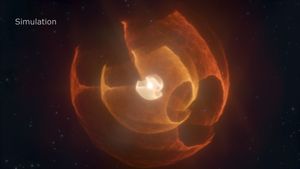 This scientific visualization models what three of the four dust shells sent out by two Wolf-Rayet stars in the Apep…