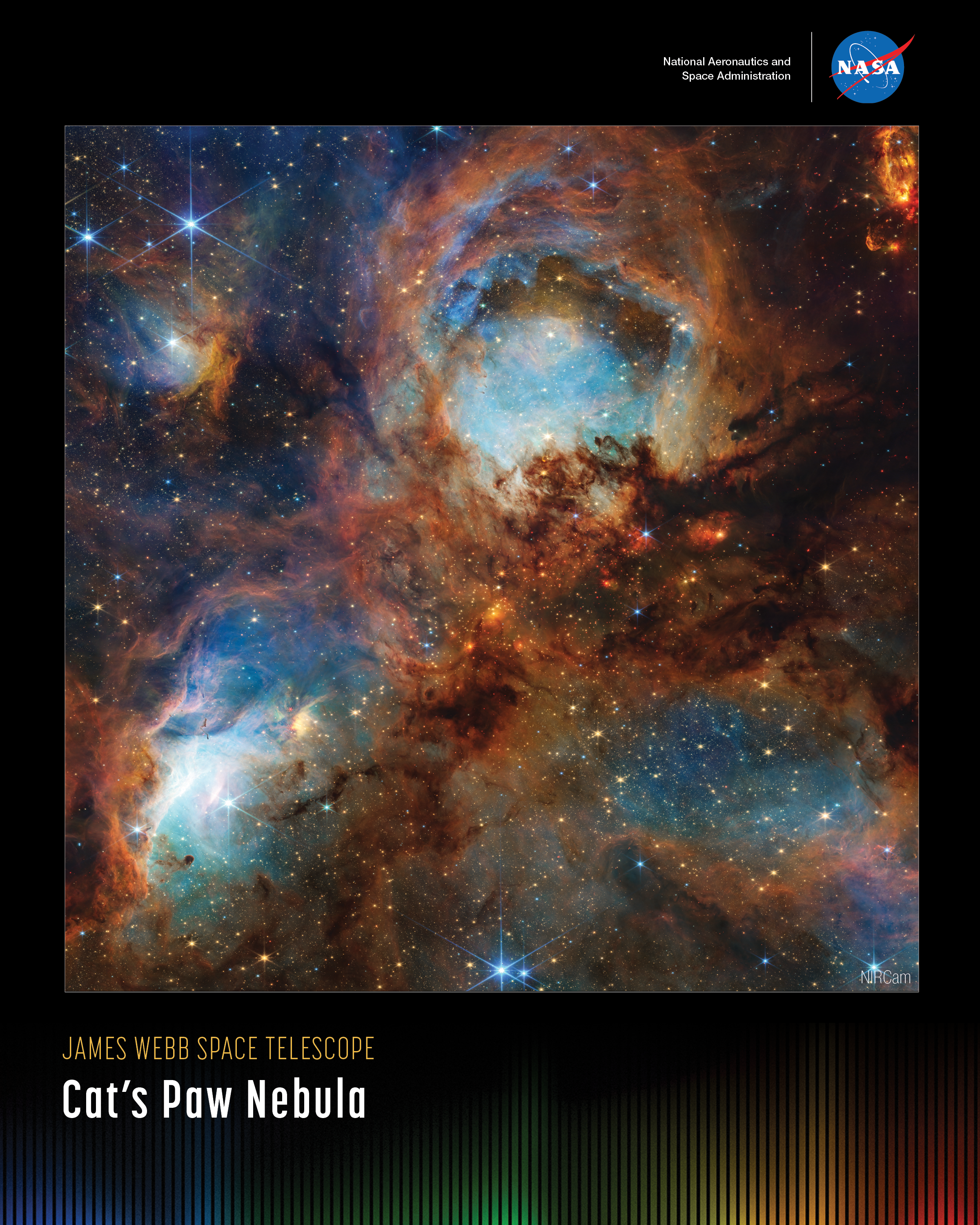 A vertically oriented poster with an image of the Cat’s Paw Nebula against a black background. Title, “James Webb Space Telescope: Cat’s Paw Nebula” is at lower left. Blue, white, and red NASA meatball insignia and words “National Aeronautics and Space Administration” are at upper right.