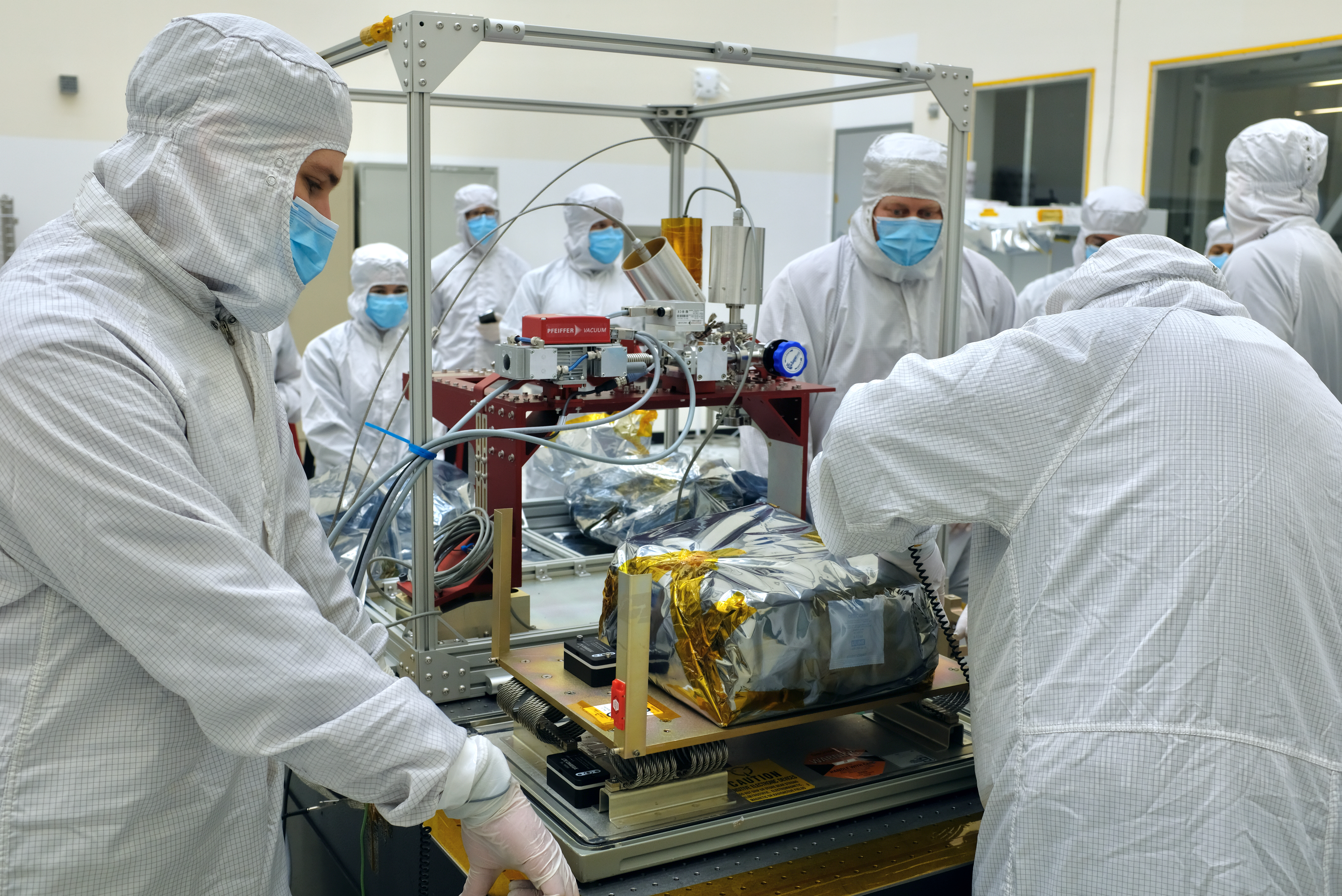 Engineers inspect Europa Clipper's ultraviolet spectrograph (called Europa-UVS) in a cleanroom at NASA's Jet Propulsion Laboratory in Southern California, following the delivery of the instrument from Southwest Research Institute (SwRI).