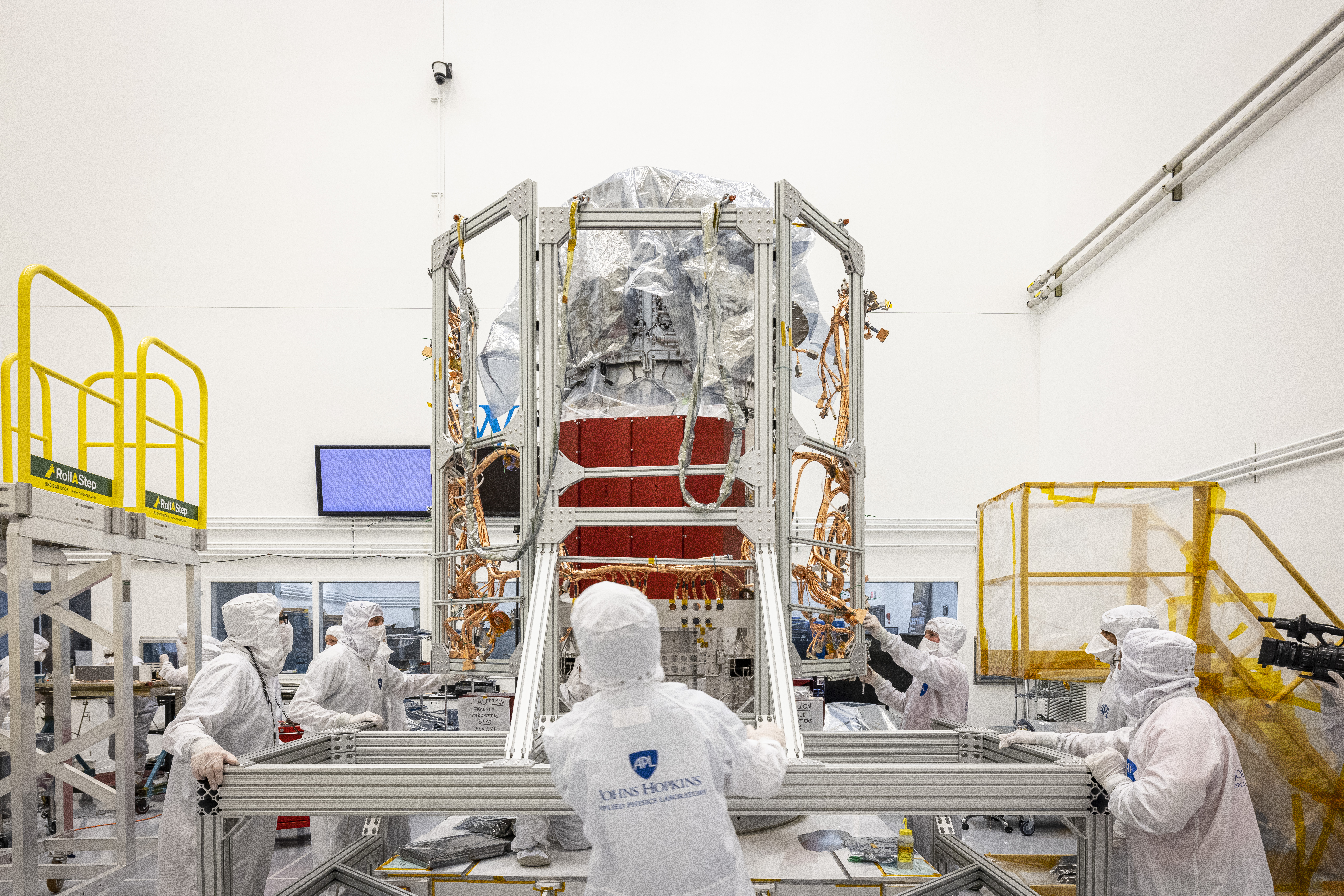 In a cleanroom at the Johns Hopkins Applied Physics Laboratory in Laurel, Maryland, Europa Clipper's propulsion module harness, installed onto a bake-out fixture, is rolled up to the propulsion module in preparation for transfer and installation.