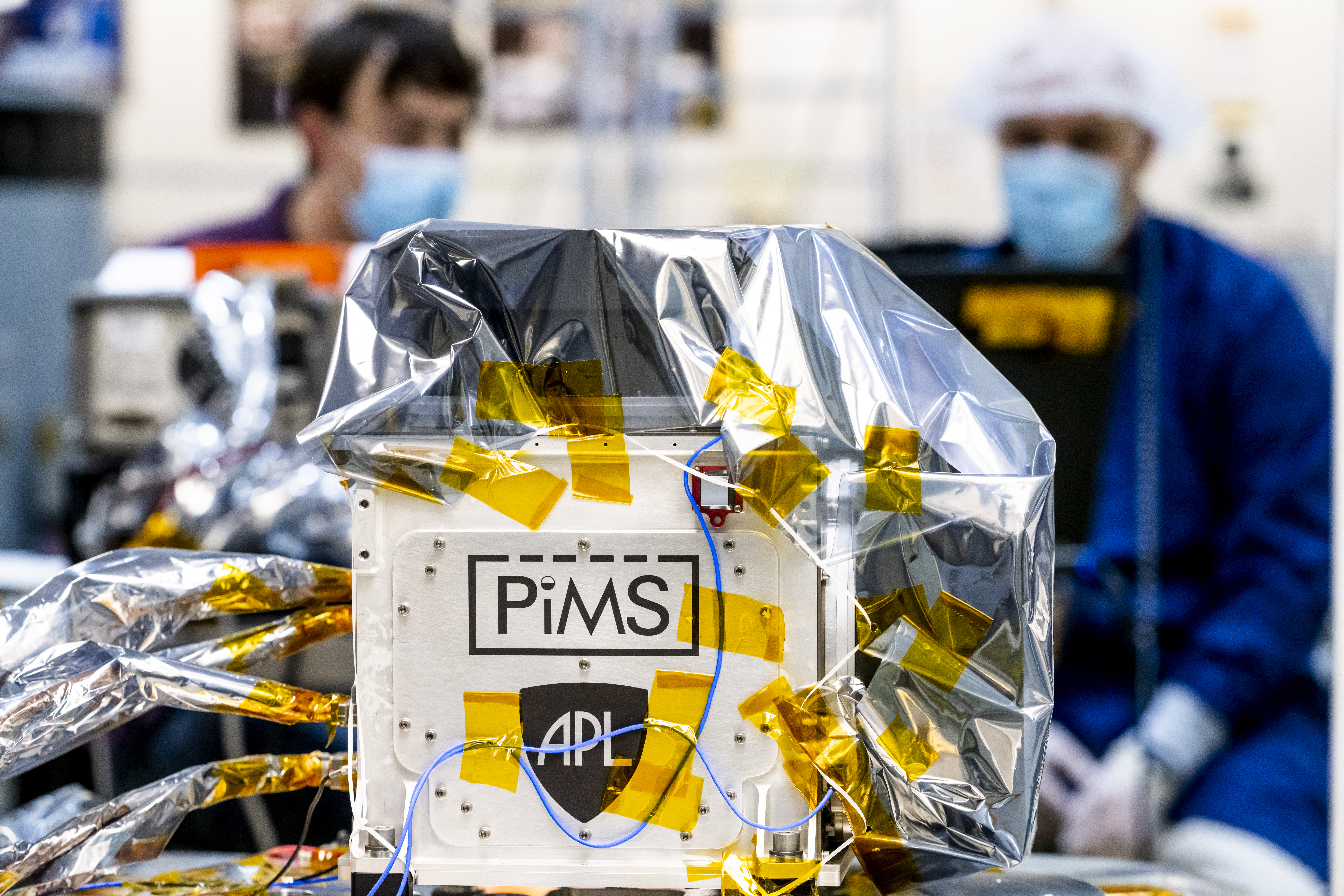 A plasma instrument (called PIMS) sensor assembly is mounted on the vibration table (also known as the vibe table or shaker) at the Johns Hopkins Applied Physics Laboratory (APL) in Laurel, Maryland, in preparation for a simulated launch test. PIMS lead engineer David Coren (left) and PIMS mechanical engineer Erik Hohlfeld (right) monitor telemetry from the instrument during the test. A protective cover is installed over the Faraday cups (top and right) to keep the instrument interior clean and free of biological contamination. Accelerometers are attached to the instrument to monitor the vibrations and forces the instrument experiences.